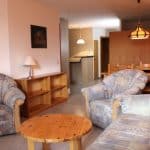 2 lits simples collés 160×200 ou lit king size 180×200 en chambre, un clic-clac dans le salon 160×200, salon, vue montagne, balcon Occupation maximum 2 adultes et 2 enfants Appartement de 2,5 pieces 55m2 orienté sud, comprenant une chambre à coucher séparée, un salon, une salle à manger, une cuisine, un espace nuit avec lit à étage et une salle de bain privée