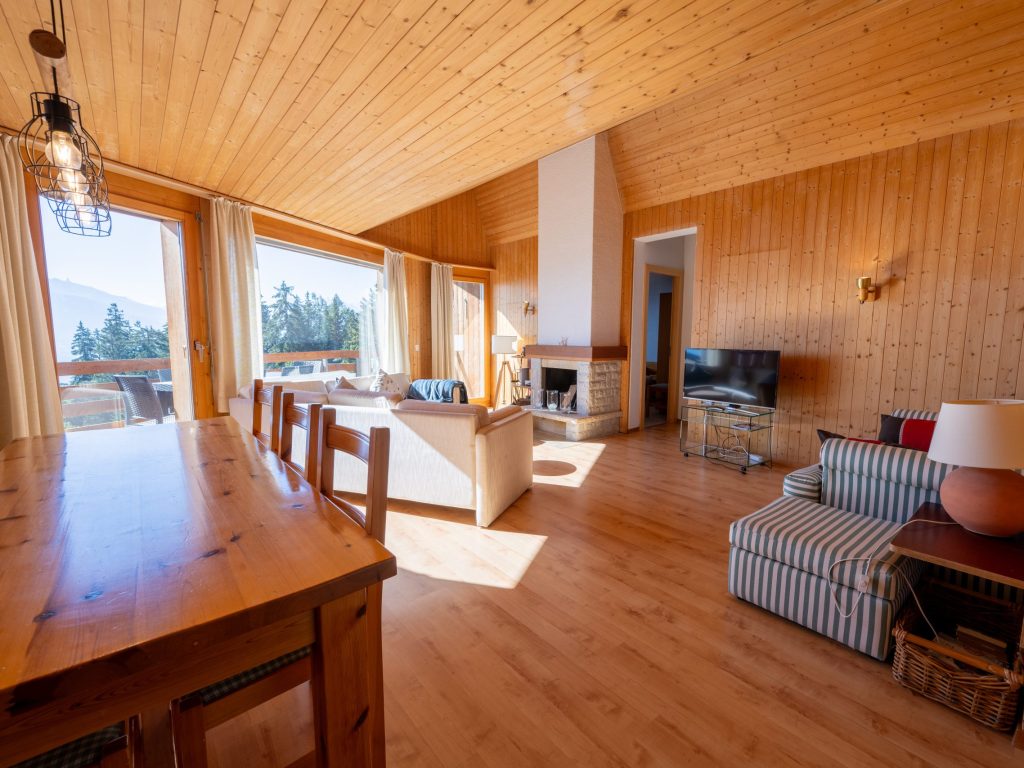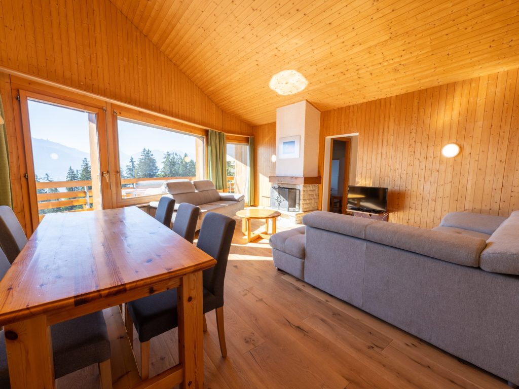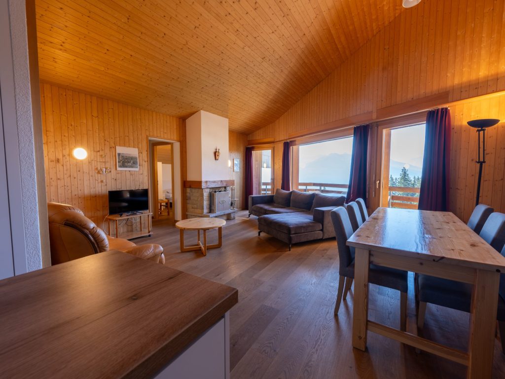 Ce joli cocon de montagne vous offre une ambiance chaleureuse et confortable avec son grand salon en bois style chalet design et sa cuisine ouverte lumineuse grâce à son magnifique puit de lumière. Sa belle mezzanine permettant d’accueillir un couchage, ses deux chambres avec deux lits twins pour la première, deux lits superposés et d’un lit simple pour la seconde, cette suite vous permet d’écrire vos vacances à Anzère en famille ou entre amis jusqu’à 6 personnes. De son balcon, vous pourrez admirer une vue spectaculaire sur les Alpes Suisses tout en profitant des rayons du soleil qui appellent à la bronzette, hiver comme été. Découvrez nos offres spéciales