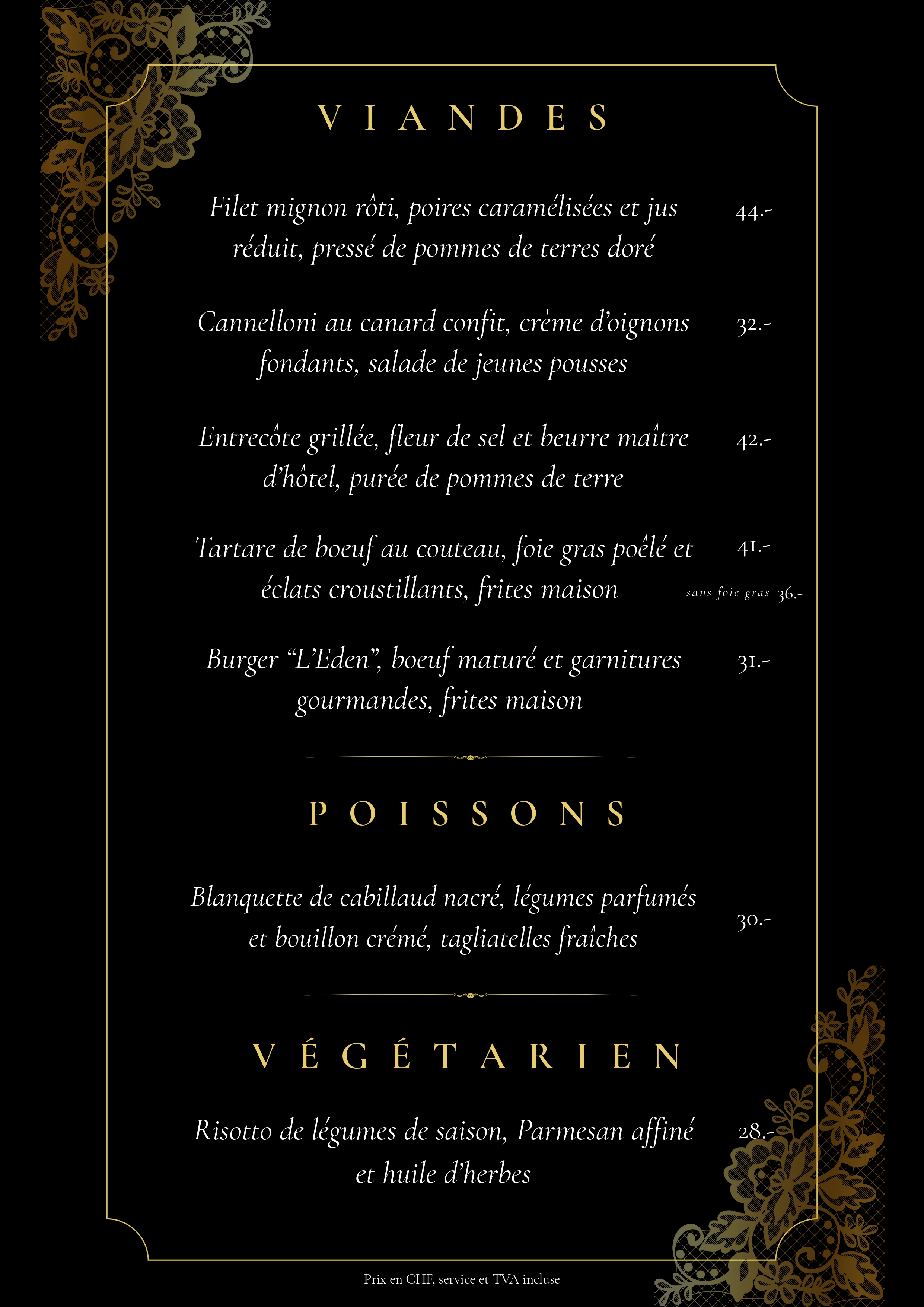 Provenance viande de boeuf : Suisse / porc : Suisse / poulet : Bresil